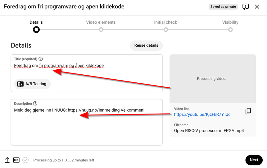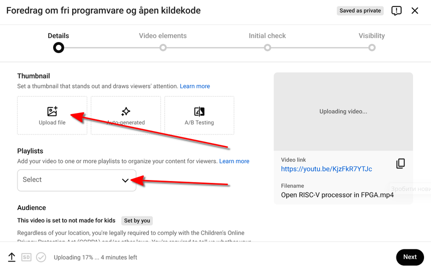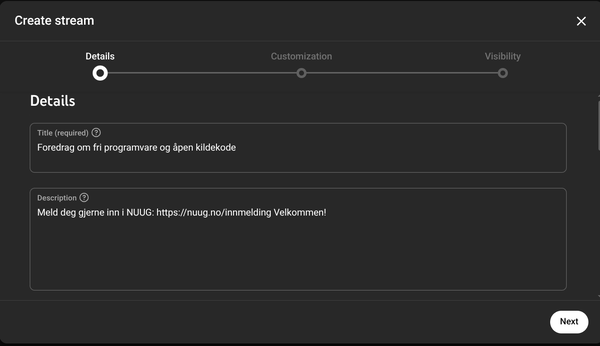 6. Legg til tittel, beskrivelse og banner (thumbnail). Velg kategori og spilleliste, og klikk Next.
