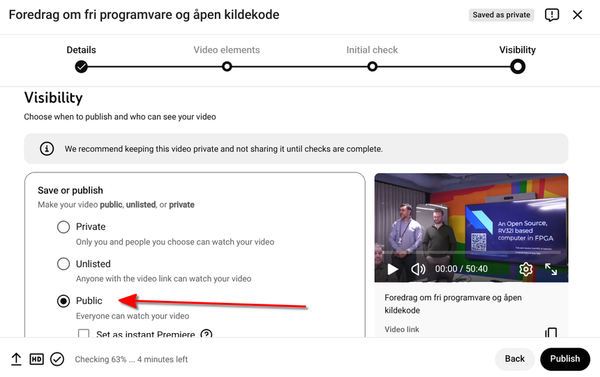 9. Gå til fanen Visibility, velg at videoen skal være offentlig (Public), og klikk Publish.